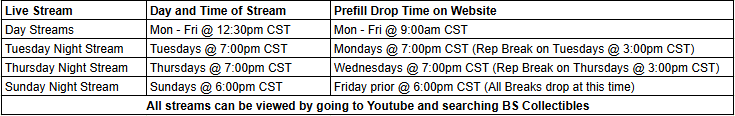 Where do I watch the Live Streams? Our Youtube Channel BS Collectibles.